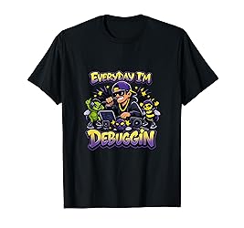 - A clean debugging humor graphic built around the phrase Everyday Im Debuggin in a hip hop graffiti font, paired with an MC coder on the mic and bug dancers in purple and yellow. Made for programmers, developers, QA testers, and anyone who lives in IDEs and late night fixes, this design brings code jokes to work, school, meetups, and tech events.