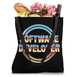 This design proudly declares that you are a Software Developer Fun retro vintage style for men or women 16” x 16” bag with two 14” long and 1” wide black cotton webbing strap handles. Made of a lightweight, spun polyester canvas-like fabric. All seams and stress points are double-stitched for durability, and the reinforced bottom flattens to fit more items and hold larger objects. Spot clean/dry clean only.