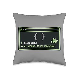 Clean tech humor design featuring the classic developer phrase IT WORKS ON MY MACHINE, created for software developers and programmers who enjoy real coding inside jokes and build moments Inspired by code editors, terminal windows, and everyday debugging experiences, this design connects with developers who work with code, builds, and modern software projects 100% spun-polyester fabric Double-sided print Filled with 100% polyester and sewn closed Individually cut and sewn by hand Spot clean/dry clean only