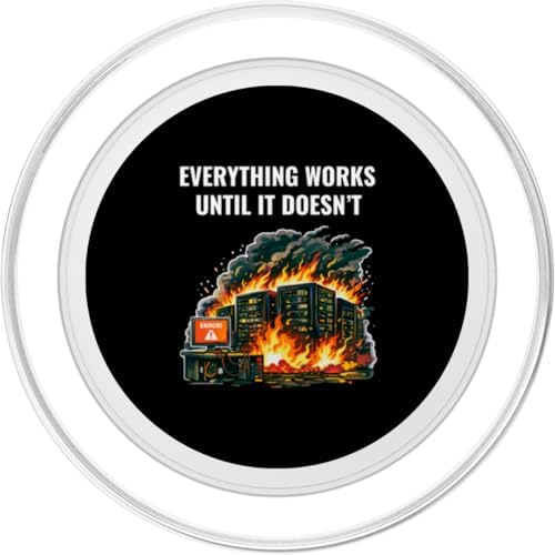 - Everything Works Until It Doesn’t Funny design shows a burning server room with an error screen, capturing the reality of outages, failures and unexpected production issues.