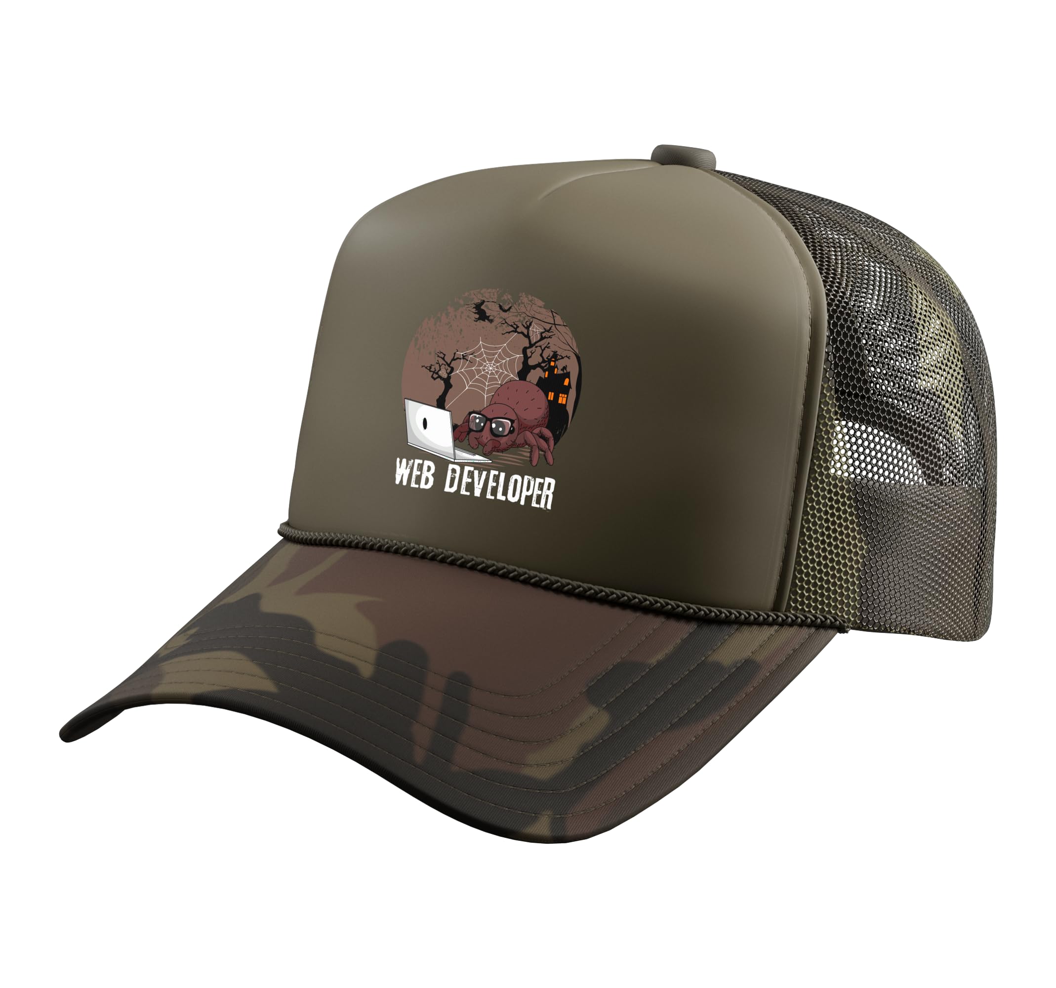 Show your expertise with this funny "Web Developer" design with a spider working on the laptop with spooky background, that makes it perfect for computer programmers, and software developers, who create and maintain websites and digital products. Make your programmer co-worker, dad, mom, aunt, or uncle, laugh with this funny Web Developer design that is ideal to wear at work whether at home or in the office. Also a great outfit for Trick or Treat or Halloween. Classic five-panel structured baseball hat with high-profile crown Adjustable fit; one size fits most adults