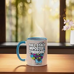 Features the quote "Full-Stack Imposter Syndrome" with a chaotic explosion of code icons. This design is perfect for the software engineer, web developer, or computer science student who handles frontend, backend, and existential dread all at once. Ideal for the Python, Java, or JavaScript coder in your life. Whether they are a CS major, sysadmin, or self-taught programmer, this makes a relatable present for the tech worker who spends their day debugging and feeling like they are faking it. 11-ounce ceramic mug is dishwasher and microwave-safe, lead and BPA free Features glossy finish with accent colors on interior, handle, and rim of two-tone designs