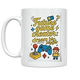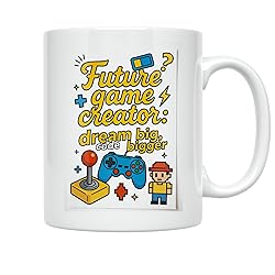 INSPIRING DESIGN: Features 'Future Game Creator: Dream Big, Code Bigger' text with vibrant gaming icons including joystick, game controller, and pixel character in bright yellows, blues, and reds to spark creativity. QUALITY CONSTRUCTION: Made from durable white ceramic material with 11 oz capacity, perfect for daily coffee or tea while coding, gaming, or brainstorming creative projects. DOUBLE-SIDED PRINTING: Design printed on both sides of the mug for versatile display and enjoyment from any angle, ensuring the inspiring message is always visible. CONVENIENT CARE: Dishwasher and microwave safe for easy cleaning and reheating, making it practical for busy young developers and students on the go. PERFECT GIFT IDEA: Ideal present for aspiring game developers, coders, and gaming enthusiasts for birthdays or special occasions, adding fun inspiration to any desk, home, or office space.