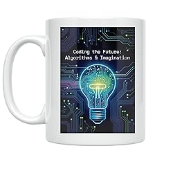 - Start your day with inspiration using this striking 11 oz white ceramic coffee mug that celebrates the intersection of technology and creativity. Featuring the motivational phrase 'Coding the Future: Algorithms & Imagination,' this mug showcases an eye-catching design with intricate circuit board patterns flowing into a luminous light bulb symbol. The vibrant neon blue and green accents pop against the dark background, creating a visually stunning piece that resonates with developers, programmers, and tech enthusiasts. The monospaced typography adds an authentic coding aesthetic to the overall design. Crafted from high-quality ceramic, this durable 11 oz mug is perfect for your morning coffee, afternoon tea, or any favorite beverage throughout your workday. The design is printed on both sides, ensuring the inspiring message is visible from any angle. Dishwasher and microwave safe for convenient daily use, this mug fits seamlessly into your home office, workspace, or kitchen. Whether you're debugging code, brainstorming algorithms, or simply taking a well-deserved break, this mug serves as a constant reminder of the innovative spirit that drives the tech world forward. An ideal choice for yourself or as a thoughtful gift for the tech-savvy individuals in your life.