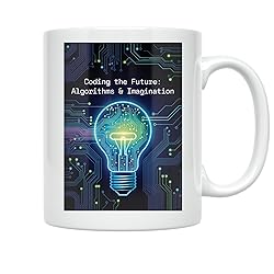 INSPIRING DESIGN: Features 'Coding the Future: Algorithms & Imagination' text with intricate circuit board patterns merging into a glowing light bulb, representing innovation and creativity in technology. PREMIUM QUALITY CERAMIC: Made from durable white ceramic material with 11 oz capacity, perfect for enjoying coffee, tea, or any favorite beverage during work breaks or leisure time. DOUBLE-SIDED PRINTING: Vibrant design printed on both sides with neon blue and green accents against a dark background, creating striking visual contrast that tech enthusiasts will love. PRACTICAL AND CONVENIENT: Microwave safe and dishwasher safe for easy cleaning and reheating, lightweight construction makes it comfortable to hold and use daily. PERFECT GIFT FOR TECH LOVERS: Ideal for developers, programmers, coders, and anyone passionate about technology, algorithms, and innovation - great for home, office, or workspace decor.