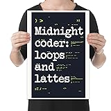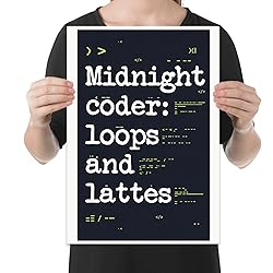 PROGRAMMER HUMOR DESIGN: Features the witty phrase 'Midnight Coder: Loops and Lattes' in monospaced typewriter font with code snippet accents on a dark navy background with neon green highlights, perfect for tech enthusiasts. HIGH-QUALITY PRINT MATERIAL: Printed on glossy photo paper with fade-resistant ink, ensuring vibrant colors and long-lasting durability for your wall decor. GENEROUS SIZE: Measures 13 x 19 inches in landscape orientation, providing an eye-catching statement piece for your home office, bedroom, or workspace. VERSATILE INDOOR DECOR: Ideal for family rooms, bedrooms, home offices, playrooms, and kitchens, adding a modern techy vibe to any space where programmers and coders gather. LIGHTWEIGHT AND READY TO DISPLAY: Weighing only 0.3 pounds and arriving unframed, this poster is easy to hang and can be customized with your choice of frame to match your decor style.