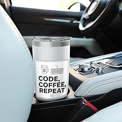 Minimalist coding design featuring the phrase “Code, Coffee, Repeat” with clean line icons for coffee and keyboard, appealing to programmers, coders, developers, and software engineering enthusiasts. Relevant for mom, dad, brother, sister, coworker, or friend in the tech space; works well for occasions like Christmas, Father’s Day, Mother’s Day, or Programmer Day. Dual wall insulated: keeps beverages hot or cold Stainless Steel, BPA Free Leak proof lid with clear slider