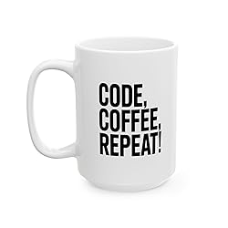- Kickstart your day with the perfect mug designed for coding enthusiasts Introducing our 'Code, Coffee, Repeat' ceramic mug, a must-have for every programmer and tech lover. Featuring bold, eye-catching typography, this durable white mug is available in both 11oz and 15oz sizes. The sleek black font contrasts beautifully against the pristine ceramic, making your favorite coffee, tea, or hot chocolate taste even better. It's not just stylish; it's functional, too The BPA and lead-free ceramic ensures a safe drinking experience, and being microwave and dishwasher-safe means easy cleaning and reheating. Perfect for the office or home workspace, this mug elevates your coffee moments and serves as a daily reminder to power through your coding tasks with a smile. Ideal as a gift for birthdays, holidays, or 'just because' occasions. Get your hands on this unique mug to recharge your creativity and fuel your coding passion. Don't miss out—order your 'Code, Coffee, Repeat' mug today and make each sip count