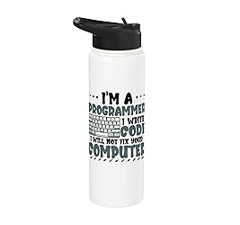 Funny programming themed motif for programmers who love to write code. I'm A Programmer I Write Code I Will Not Fix Your Computer - showcase that you are a programmer and not a tech support worker. Dual-wall insulated stainless steel construction keeps beverages hot or cold, dishwasher safe and BPA free Leak-proof flip lid includes BPA free plastic drinking straw
