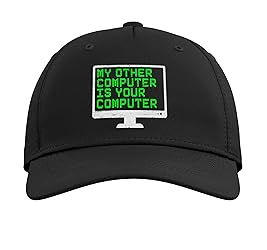 My Other Computer Is Your Computer - This is for computer hackers looking for hacker stuff to wear while phishing. A gifts for a professional game hacker who can bypass any cybersecurity. Ideal for hacker outfit to show your hacking knowledge. This hacking graphic is for programmers and pen testers doing some penetration test to prevent password attacks. A present for proud hackers who are experts in cybersecurity hacking. Impress everyone at the next hackathon wearing this hacker apparel. Classic five-panel structured baseball hat with high-profile crown Adjustable fit; one size fits most adults