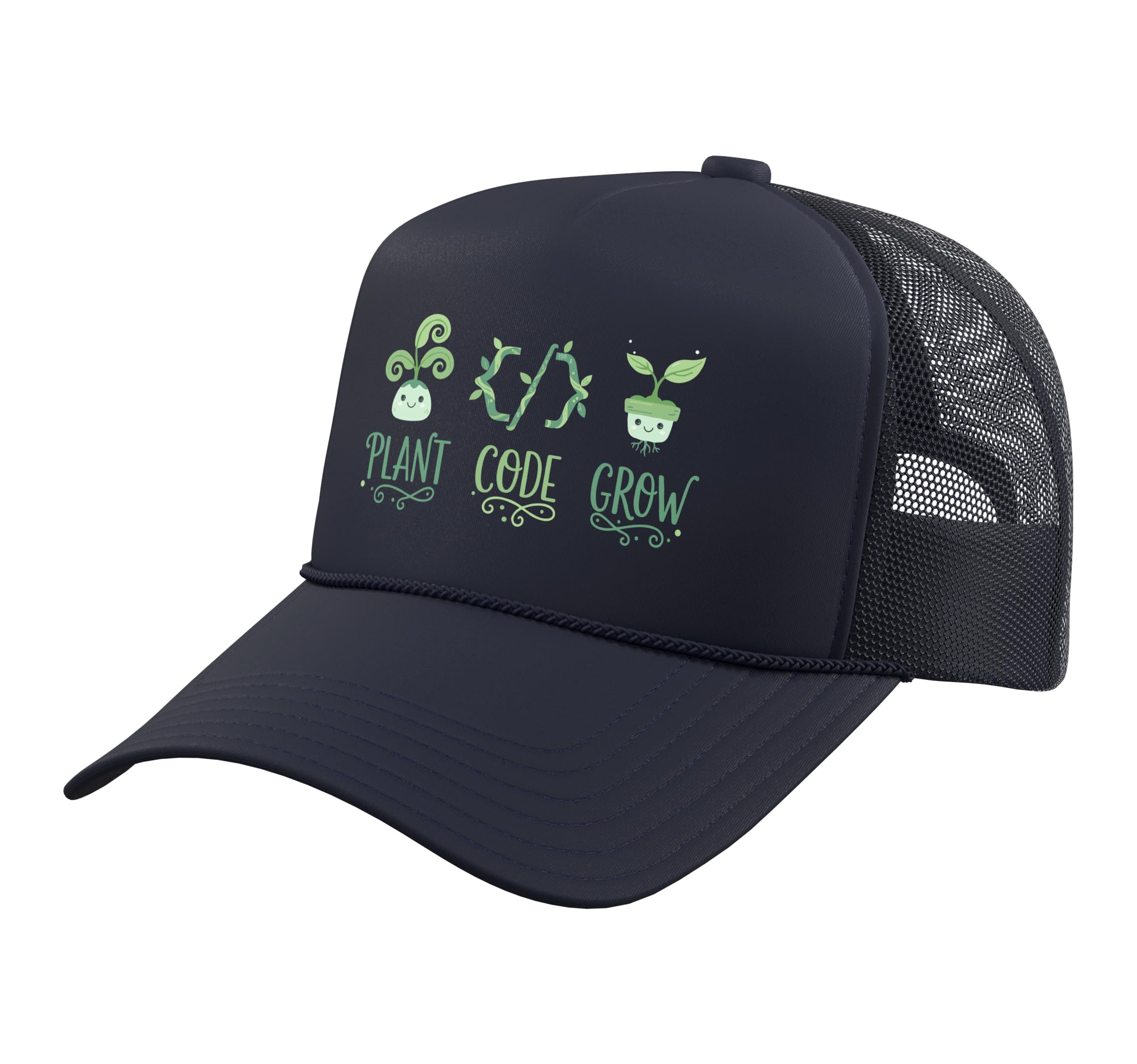 Plant Code Grow design featuring leafy brackets, cute plant characters, and coding symbols for programmers, software developers, web developers, computer science students, and tech professionals who love gardening and creative coding humor. Fun for mom, dad, brother, sister, son, daughter, husband, wife, coworker, developer, coder, or tech enthusiast for Christmas, birthdays, graduation, back to school, and tech conferences. Classic five-panel structured baseball hat with high-profile crown Adjustable fit; one size fits most adults