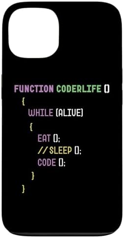- Funny programmer design styled like real code featuring “Function CoderLife()” and the lines While (Alive) { Eat(); //Sleep(); Code(); } in colorful coding text.