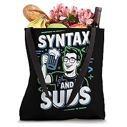 Programmer Beer Lover Alcohol Drinker Computer Programming. This Syntax And Suds is for a beer drinker who likes to debug and write codes. A funny programming clothes for a beer lover into computer programming. Searching for a cute programmer design for a beer drinker who is a computer programmer? Are you a beer lover expert in software development and programming? Then this is for you. 16” x 16” bag with two 14” long and 1” wide black cotton webbing strap handles. Made of a lightweight, spun polyester canvas-like fabric. All seams and stress points are double-stitched for durability, and the reinforced bottom flattens to fit more items and hold larger objects. Spot clean/dry clean only.