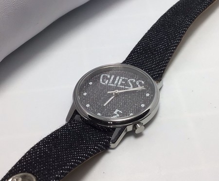 - Elevate your style with this stunning Guess Originals women's watch. Crafted with a polished stainless steel case and a two-piece denim strap in black and white, this watch is perfect for casual wear. The white and black dial features no hour marks and is powered by a reliable Japan quartz movement. The watch boasts a smooth silver bezel, a push-button deployant closure, and is water-resistant up to 30m. With its sleek round design, this watch is a must-have for any fashion-forward woman.