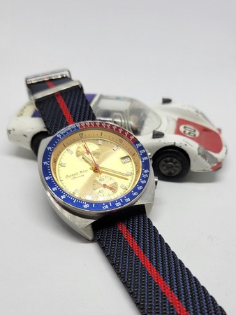 • The Detroit Mint Speedy is a VK61 Seiko Mecha-quartz movement chronograph with styling inspiration from the vintage Chronographs from the 1970s cushion case rally chronographs and speed timers. This version is the gold dial version. It comes with the H link bracelet installed and the Blue Red single pass nylon strap as well. All Detroit Mint watches ship in a Detroit mint watch roll.