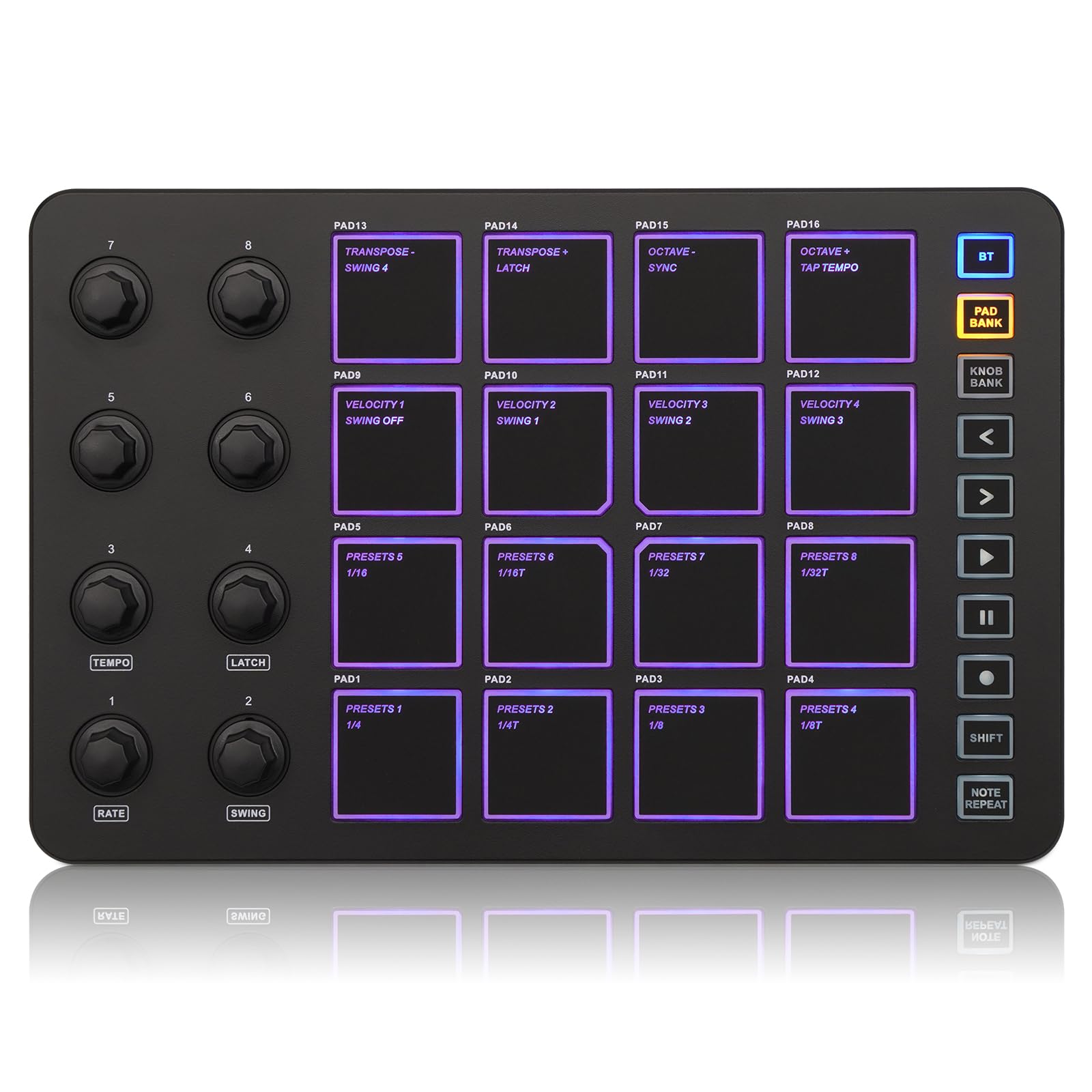 - Specifications: Material: ABS Battery: 2000mAh Keys: 25 velocity-sensitive key Pads: 8 RGB back-lit pads with velocity-sensitive aftertouch Knobs: 8 assignable endless 360 degree encoders Touch Stripes: Capacitive touch-stripes pitch bend modulation control Item Size: 321 * 178 * 46mm / 12.64 * 7.01 * 1.81in Item Weight: 765g / 26.98oz Package Weight: 1043g / 36.79oz Package Size: 38 * 22 * 7cm / 14.96 * 8.66 * 2.76in Packing List: 1 * Keyboard 1 * USB Cable 1 * Manual (English)