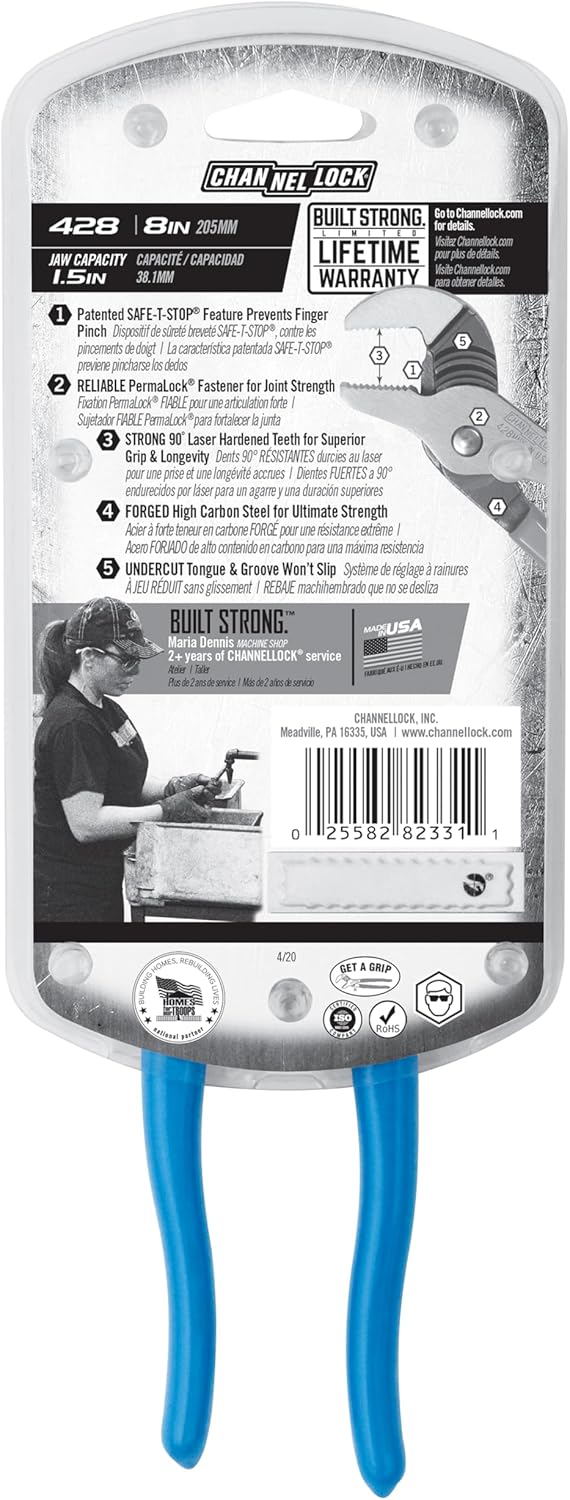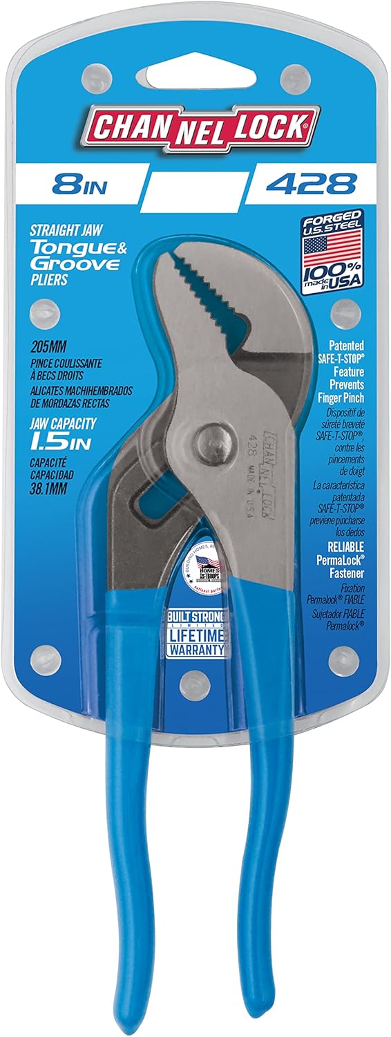 CHANNELLOCK 428 8-inch Straight Jaw Tongue & Groove Pliers, Made in USA, Forged High Carbon Steel