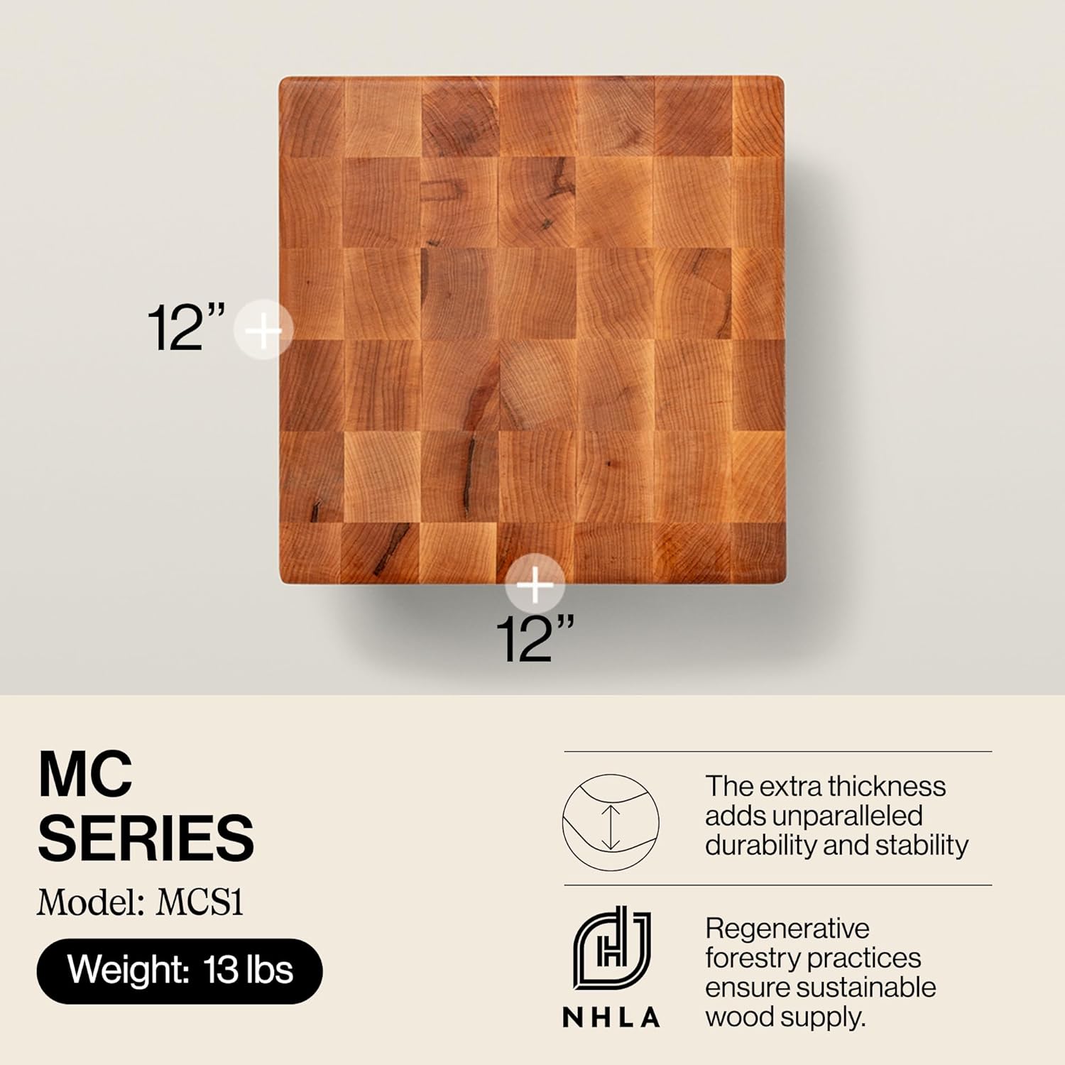 John Boos MC Series Square Wooden Maple Cutting Board 12”x12” – 3” Thick, 13-lb Non-Reversible Butcher Block with Raised Feet & End-Grain
