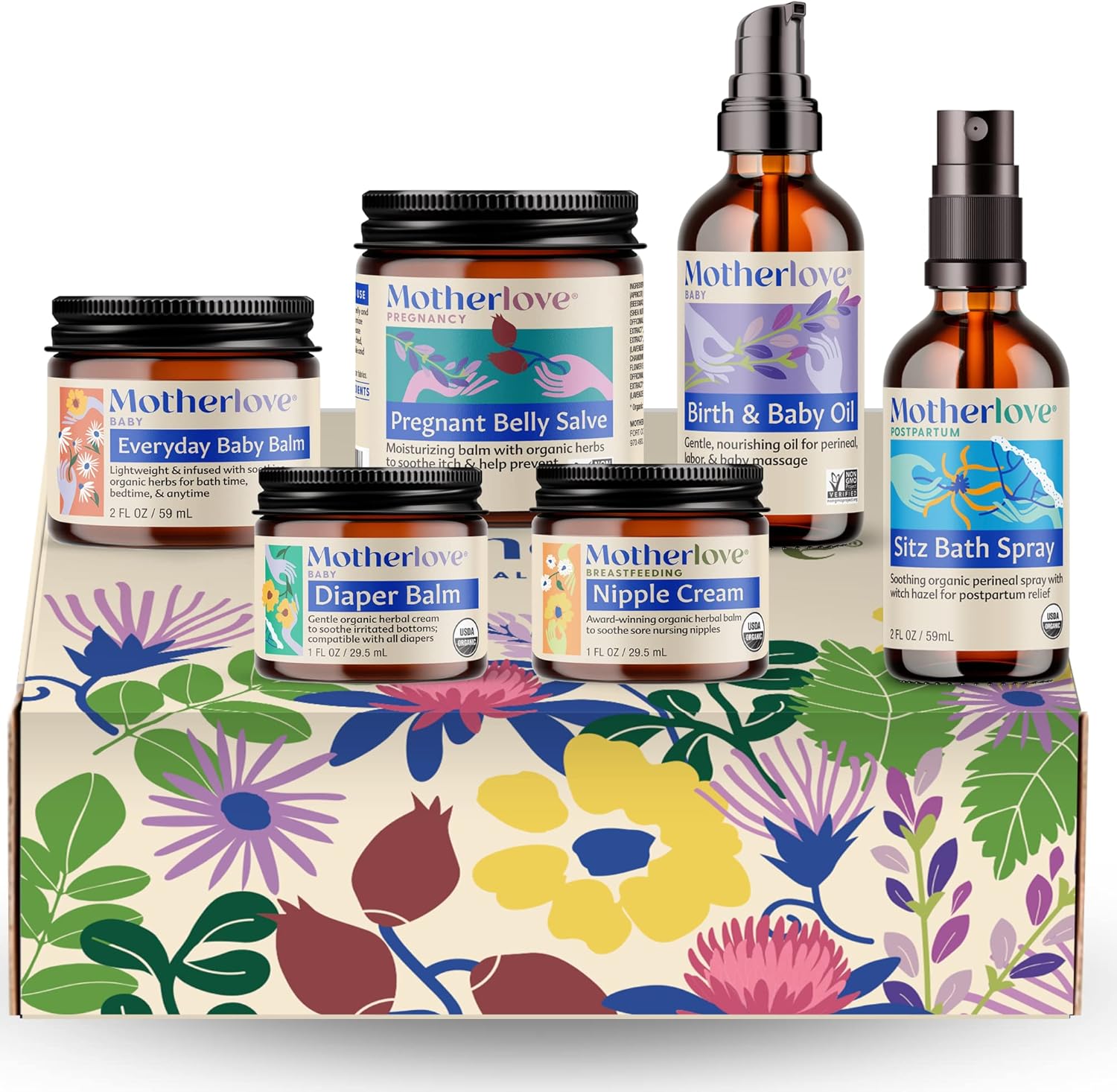 Contents: Non-GMO Pregnant Belly Salve, organic Sitz Bath Spray, non-GMO Birth & Baby Oil, organic Diaper Balm, non-GMO Everyday Baby Balm, and our award-winning organic, lanolin-free Nipple Cream.