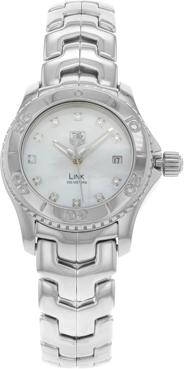 Caja y brazalete de acero pulido, esfera de diamantes MOP 11 blanca, cristal de zafiro convexo resistente a arañazos, bisel giratorio unidireccional con borde festoneado, corona y fondo de la caja roscadas, movimiento suizo de cuarzo, resistencia al agua hasta 200M: Tag Heuer Link - WJ1319.BA0572