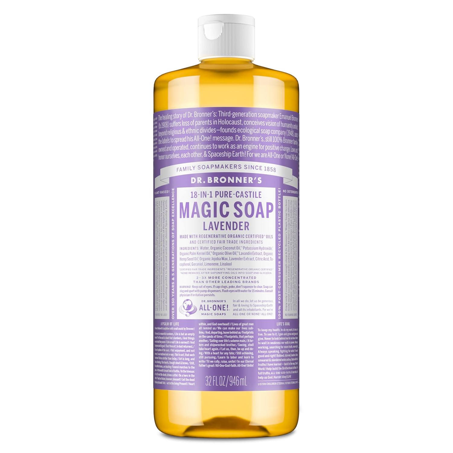 Dr. Bronner’s Jabón Líquido Puro de Castilla Mágico - Hecho con Aceites Orgánicos Regenerativos Certificados - 18 Usos para Rostro, Cuerpo, Manos, Cabello - Suave para Piel Sensible - Jabón Corporal Natural - Lavanda, 32oz