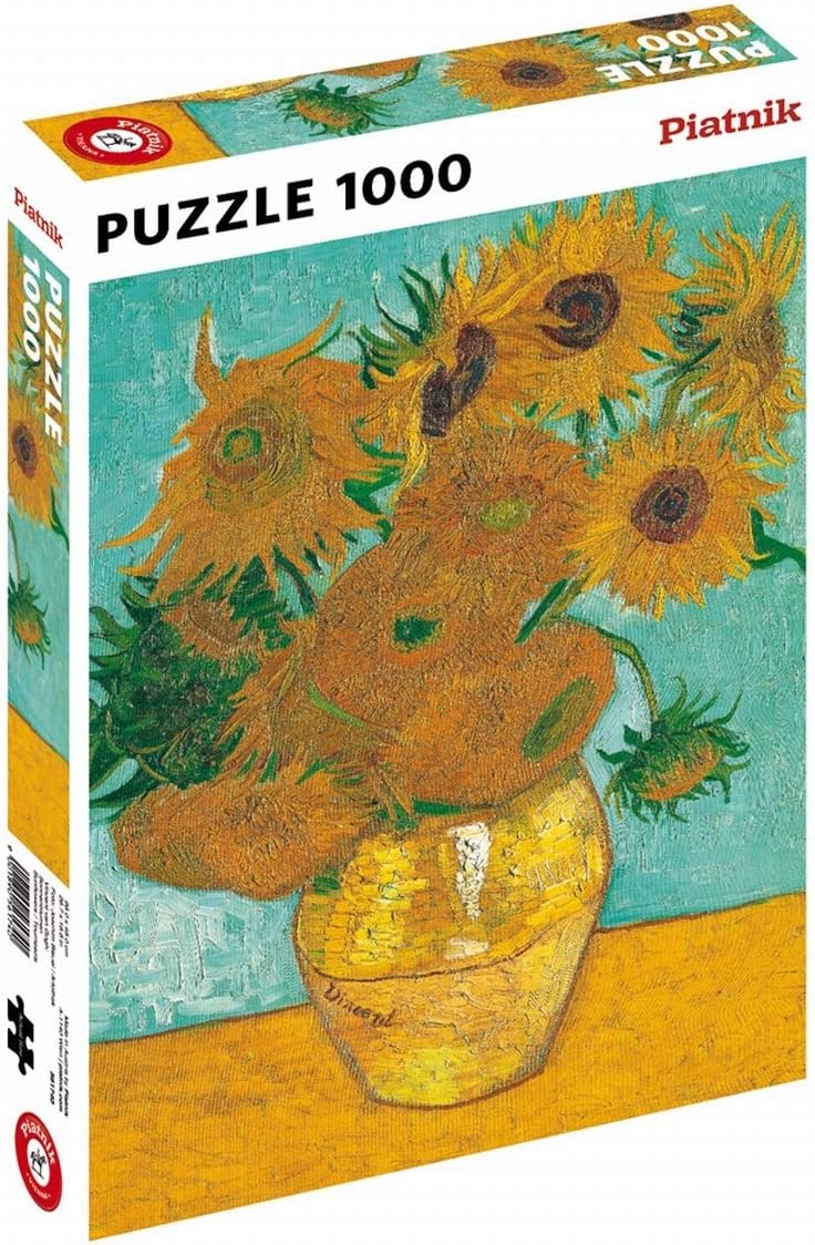 Sunflowers is one of a series of painting on the same topic by Vincent Van Gogh. This version, in a 1000 piece jigsaw puzzle form has a blue background and a yellow vase. The finished puzzle measures 26.5" x 17.4". It is made in Austria by Piatnik.
