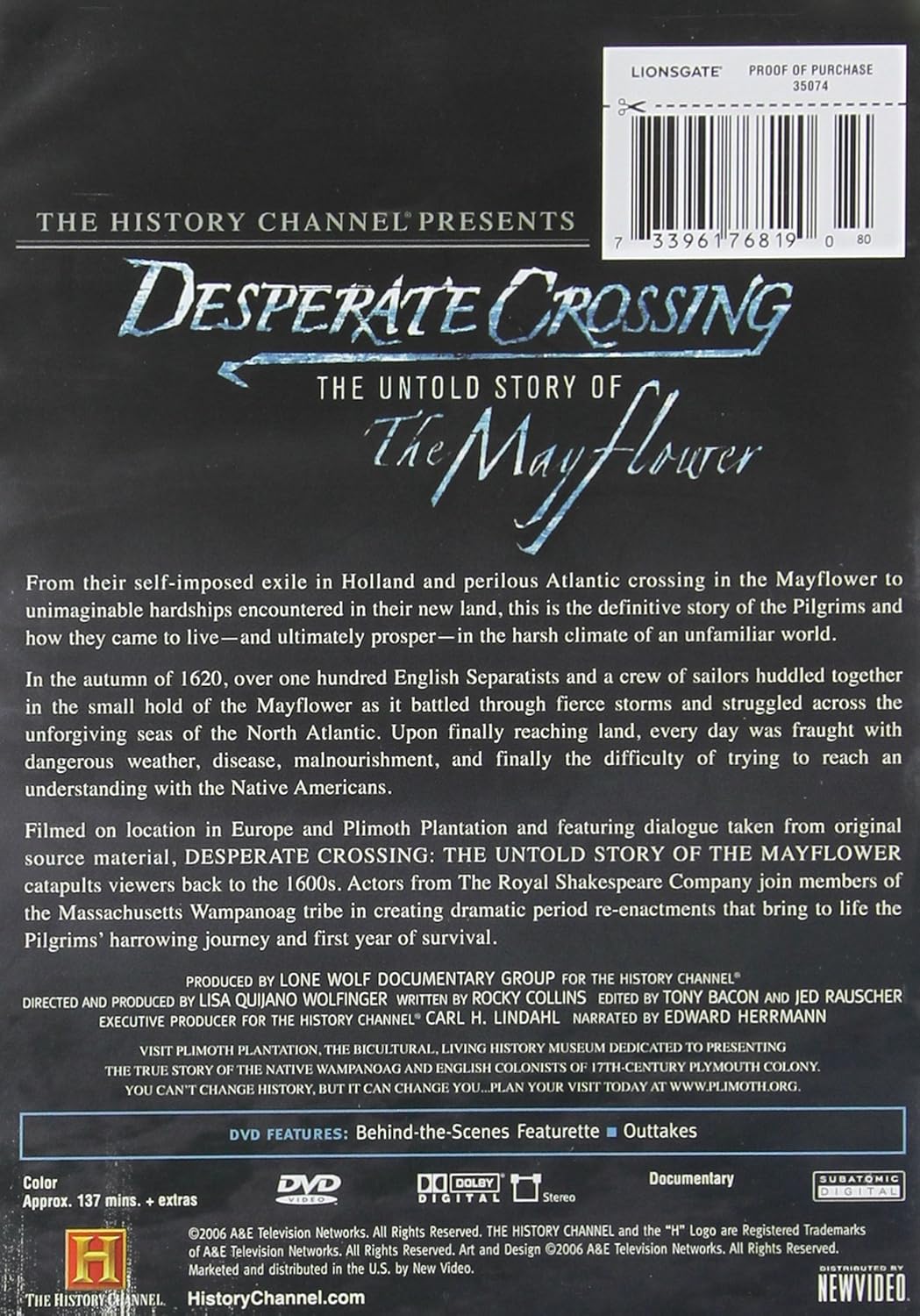 Filmed on location in Europe and Plymouth Plantation and featuring dialogue taken from original source material, DESPERATE CROSSING: THE UNTOLD STORY OF THE MAYFLOWER catapults viewers back to the 1600s. Actors from the Royal Shakespeare Company join members of the Massachusetts Wampanoag tribe in creating dramatic period reenactments that bring to life the Pilgrims' harrowing journey and first year of survival. (New Video)