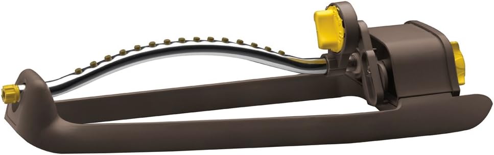 The lr nelson 15-jet oscillating sprinkler features impact-resistant plastic to standup to outdoor conditions. The spray tube features 15 water jets & cover-up to 2,750 square' of watering coverage. 50905 features: -turbo Heart oscillating sprinkler. -Impact-resistant, plastic body & knob. -Easily shut off water from your water source. -Shut-off knob controls water from full-on to full-off. Sprinkler type: -oscillating. Base type: -sled. Sprinkler location: -above ground. Color: -yellow. Base material: -plastic. Head material: -aluminum.# of items included: -1 coverage area: -2750 square'. dimensions: overall height - top to bottom: -3.4". overall width - side to side: -5.9". overall Depth - front to back: -15.75". overall product weight: -1 LB.