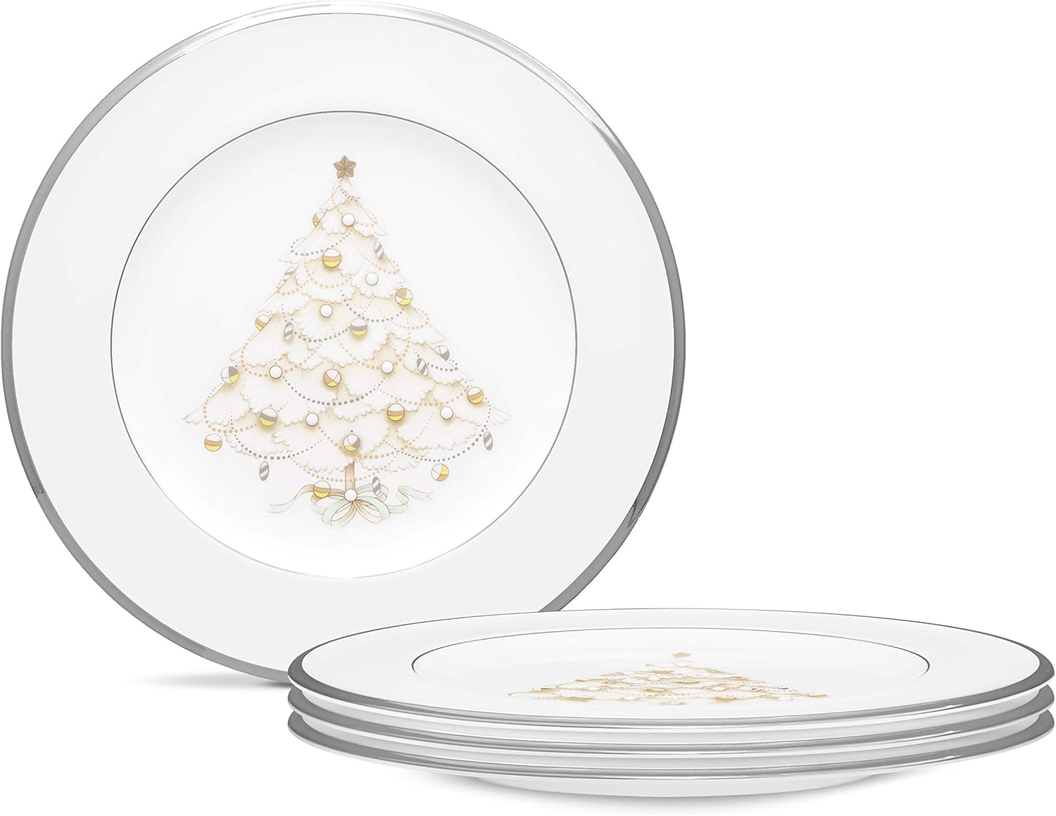 Platos decorativos navideños Noritake Palace en platino, juego de 4, blancos, 2 pulgadas