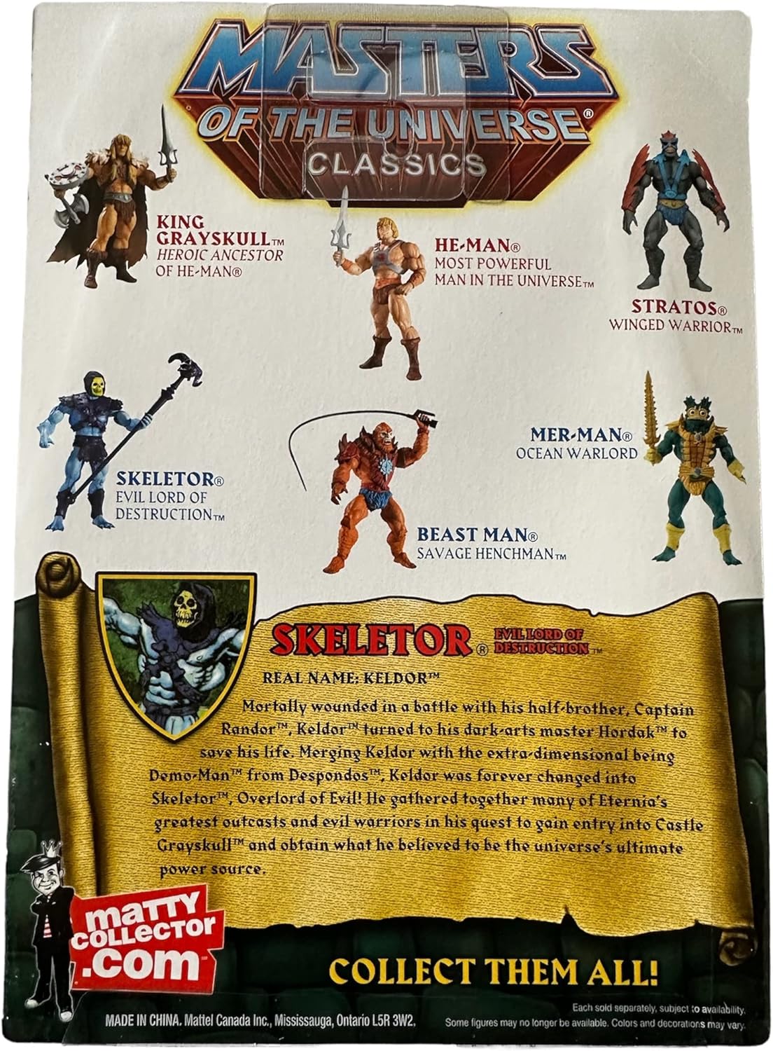 El Skeletor Clásicos (Re-Edición) presenta la frase "El Original" en la esquina derecha delantera del empaque como un homenaje al Skeletor de la línea de 1984, y presenta una serie de mejoras incluyendo el "apretón firme" de la mano izquierda, mejorada pintura facial, y modificación en su perfil de personaje para incluir la mención de Demo-Man; el Skeletor Clásicos completamente articulado está equipado con armadura de pecho removible, y viene con accesorios de espada de Poder, Media Espada de Poder y Bastón del Caos. Originado como el caudillo más humano Keldor, medio hermano del Rey Randor, Skeletor fue mortalmente herido por su propio compuesto ácido y se vio obligado a forjar un pacto oscuro con su mentor, Hordak. A cambio de la servidumbre de Keldor, fue fusionado con el Demo-Man de Despondos y transformado permanentemente en el espantoso Skeletor. Reagrupando a la horda de guerreros malvados anteriormente comandados por el carismático Keldor, Skeletor redobló su búsqueda para atravesar las paredes místicas de Castle Grayskull y obtener acceso al poder de los Ancianos.