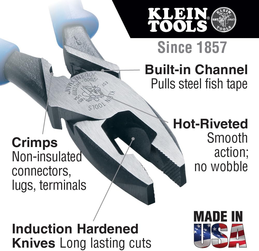 These Klein Tools Lineman's Pliers are induction hardened and have a hot-riveted joint for smooth and powerful action without handle wobble. Their unique tempered handle design, with dual material Journeyman handles provide a better grip and absorbs the snap when cutting wire, screws, nails or ACSR. These side-cutting pliers also have cross-hatched knurled jaws, and built in channels for pulling fish tapes without damage. For more than 160 years, Klein Tools has manufactured premium-quality, professional-grade hand tools that deliver the performance, durability and precision needed to get the job done right. Our family of engineers, workers and craftsman continue to put six generations of expertise into every tool we create by using only the highest quality materials, superior workmanship, and keeping manufacturing as close to home as we can. Klein isn't just the name of our company, it's also our family name. And since we're an American company that's family-owned and family-run, you know you can count on us to be here tomorrow. Klein Tools doesn't just make great products, we make great products that stand up to the demands of the professionals who use them every day ... Since 1857.