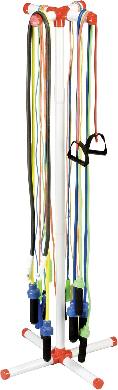 The Champion Sports Jump Rope Tree offers a practical and efficient solution for storing and organizing jump ropes. This white storage rack features four sturdy plastic bars capable of holding over 100 ropes of various lengths, preventing tangles and ensuring easy access. Constructed from durable 1.75"D plastic tubing, the Jump Rope Tree is a lightweight and resilient addition to any gym, school, or home fitness space.