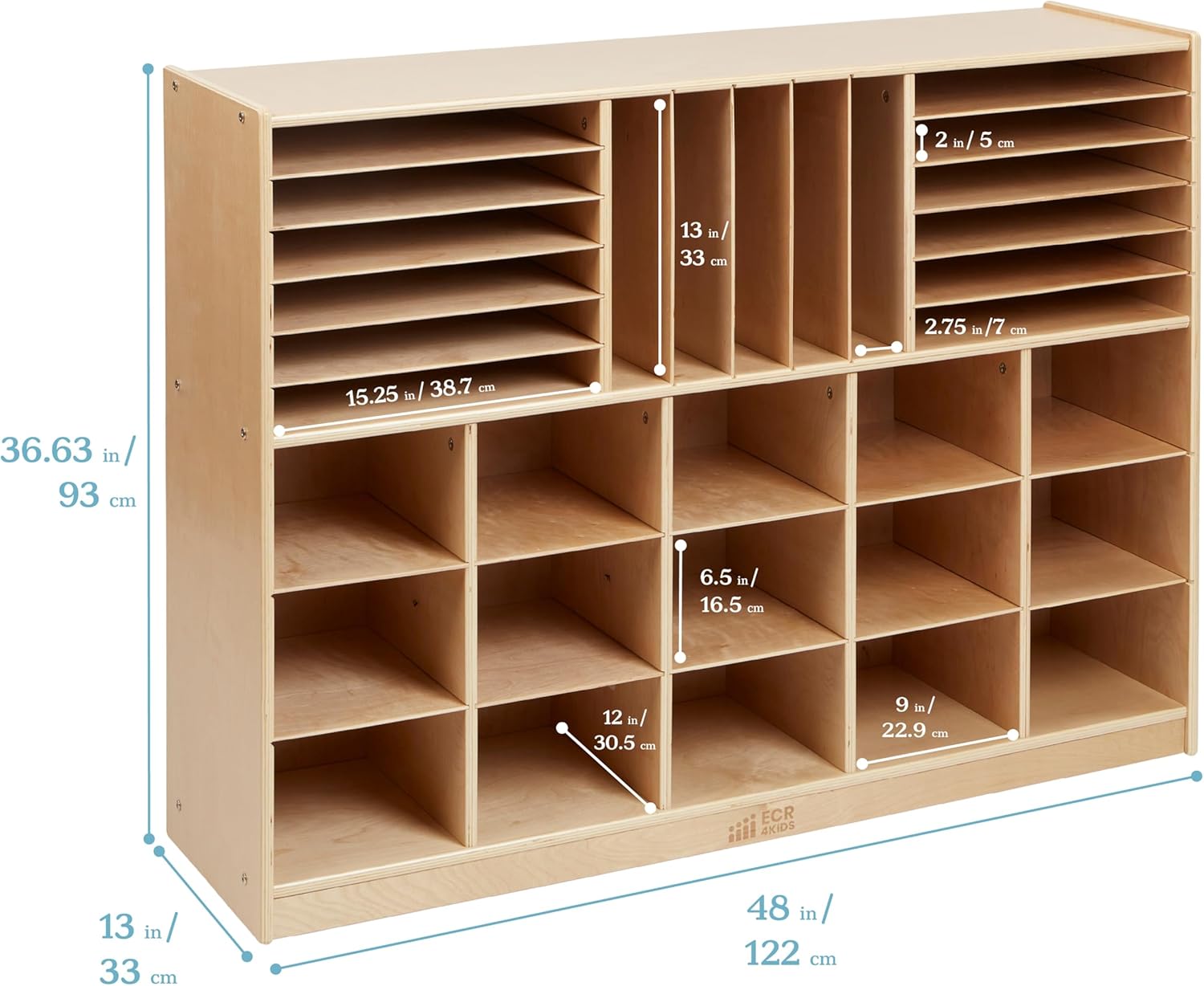 Keep your classroom organized with ECR4Kids Multi-Section Mobile Storage Cabinet with Bins. Kids and adults can organize and store toys, games, building blocks, and school supplies that may otherwise be forgotten. Designed to grow with little ones, this storage cabinet with 15 cubbies, 12 trays, and five slots helps parents, teachers, and educators keep small items within reach. The various sizes of storage slots give children their cubby at school to store homework, art pieces, and other personal items. Durable plastic bins feature rounded edges, an easy-to-grasp scoop front handle, and a curved interior to simply remove contents. Lightweight bins are easy to carry between activities. The low-profile open-face shelves encourage little ones to select their favorite activity independently, introduce organizational skills, and clean up when playtime is over. Four casters are included for mobility; move the storage unit from a hallway to the art room. Constructed from sustainably harvested birch plywood with a durable finish sealing the wood surface and resisting scratching. A UV inhibitor helps furniture resist ultraviolet light and yellowing. Birch plywood is extremely durable and will hold up to everyday use in an early childhood environment.