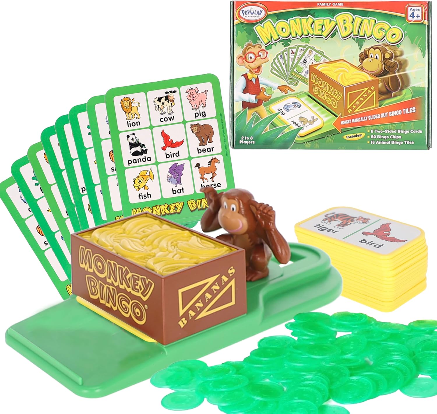 MONKEY BINGO: Este juego es más divertido que un barril de monos. Empuja el mono y una ficha de animal saldrá de la caja de plátanos; ¿coincide con uno de los animales de tu tarjeta?