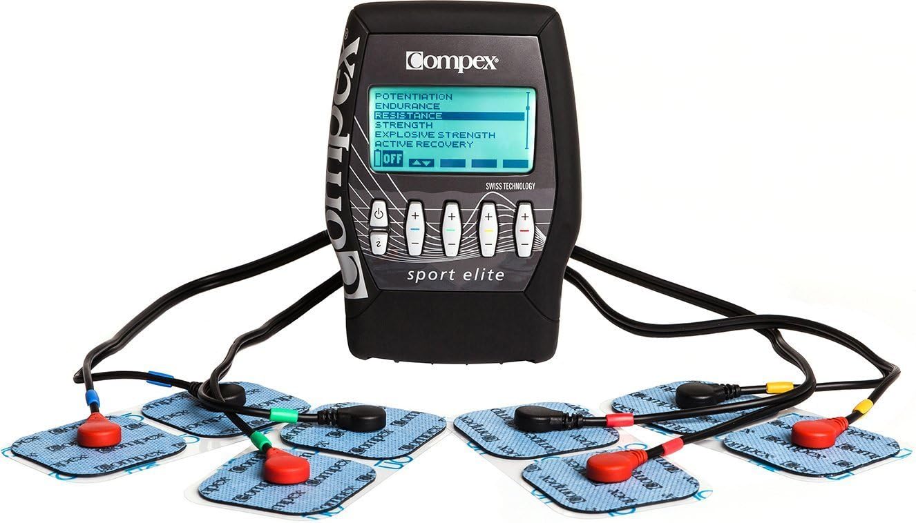 Compex Sport Elite Matte Black Muscle Stimulator Bundle Kit: Muscle Stim, 12 Snap Electrodes, 9 Programs, Lead Wires, Battery, Case / 4 Strength, 2 Warm-up, 3 Recovery