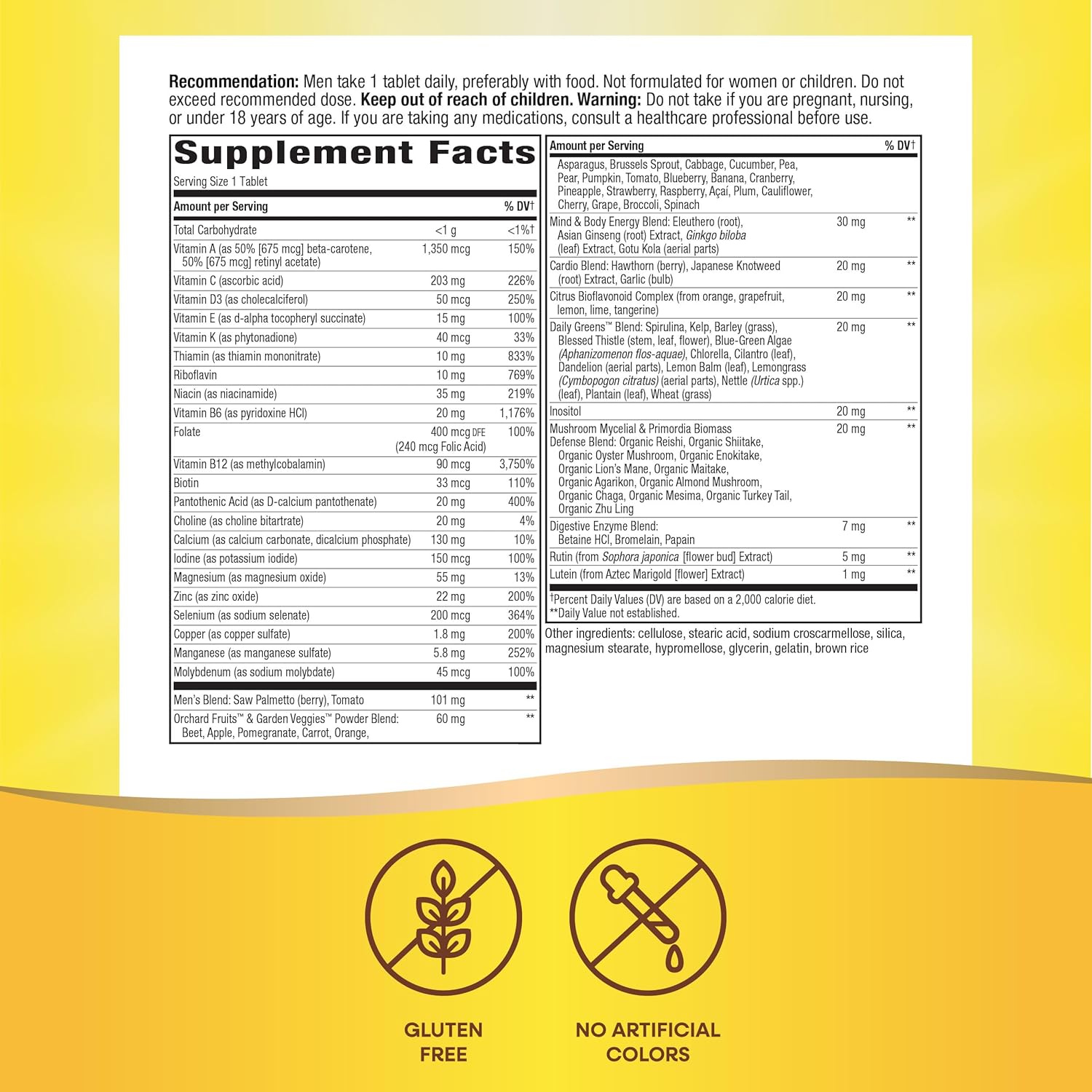 Nature's Way Alive! Multivitamínico para Hombres 50+ Ultra contiene 100% o más del Valor Diario Recomendado (VDR) de 19 vitaminas y minerales y 200% o más del VDR de 12 vitaminas y minerales. Está diseñado para apoyar la salud del corazón, la función cerebral, la salud ocular y más.* Vitaminas B premium, incluyendo ácido fólico y B12, ayudan a convertir los alimentos en energía.* También contiene mezclas en polvo específicas como Orchard Greens & Garden Veggies (60 mg por porción), Cardio, Mind & Body Energy y Daily Greens. Sin gluten y sin colores artificiales. *Esta declaración no ha sido evaluada por la Administración de Alimentos y Medicamentos. Este producto no está destinado a diagnosticar, tratar, curar o prevenir ninguna enfermedad.