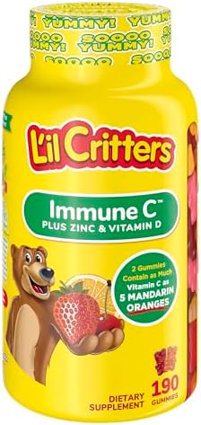 L’il Critters Suplemento de Gomitas Diarias Inmunológicas para Niños, Vitamina para Niños, Vitamina C, D y Zinc para Apoyo Inmunológico, Sabores de Naranja, Limón, Fresa y Cereza, 190 Gomitas (El Empaque Puede Variar)