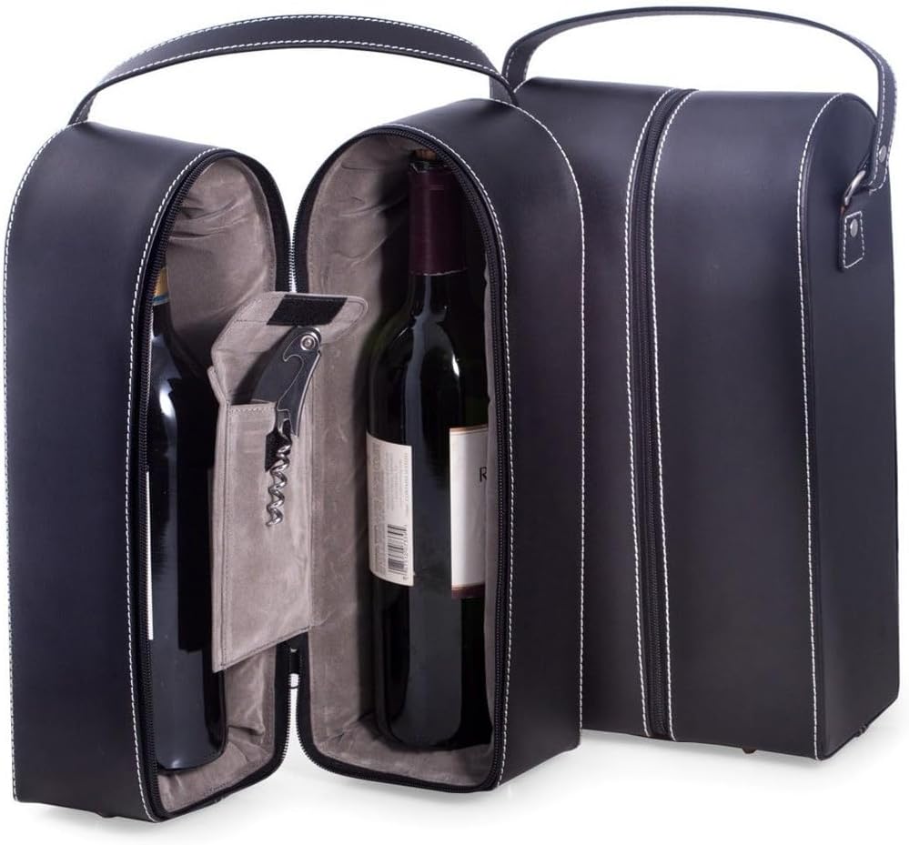 Special Features: Includes compartments for two wine bottles and a handy bar tool with corkscrew, bottle cap opener, and foil cutter.
