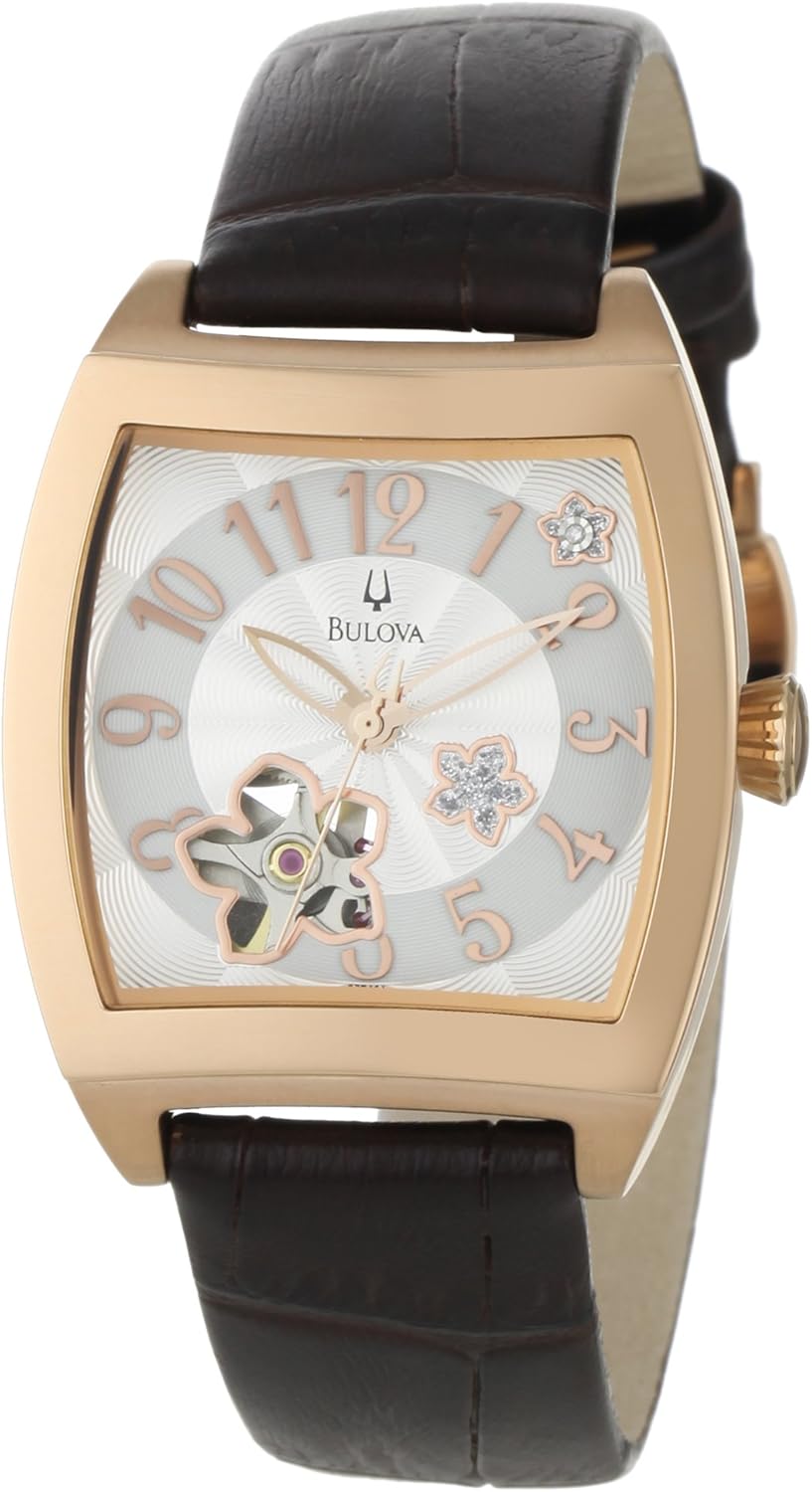 A charming floral motif enhances this classic tonneau shape with one diamond dial, classic lizard-grain leather band and a battery-free self winding movement. A design with distinctive Bulova style touches including rose-tone hands, numerals and dial details.