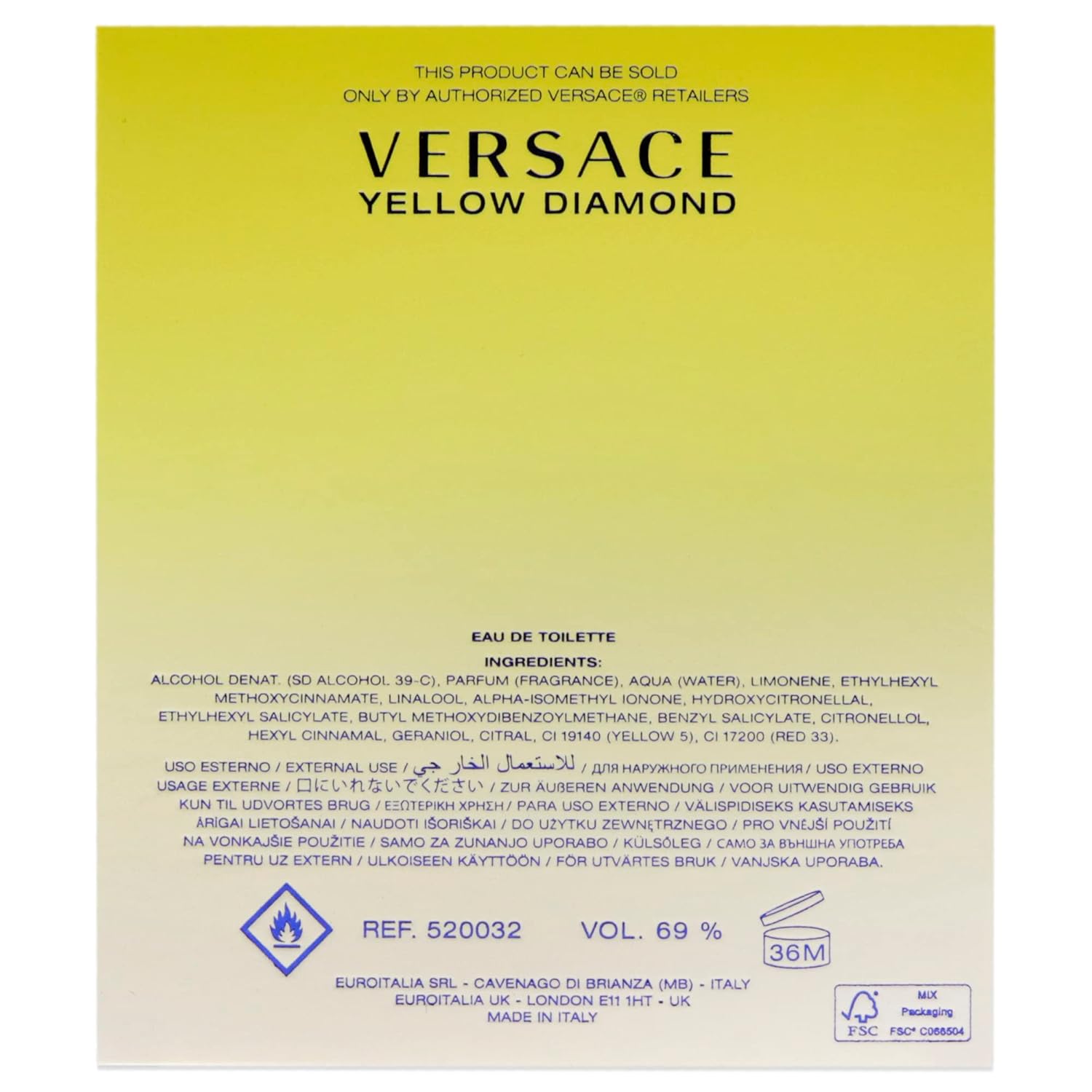 Spray de Eau de Toilette Versace Diamond, Amarillo, 3 Onzas. Un perfume que encanta con su refinamiento mediterráneo de bergamota brillante, limón de Diamante y noble neroli, con la cautivadora adición de irresistibles y atractivos acentos de sorbete de pera. El corazón celebra una feminidad intensa y glamurosa, que se expresa con facetas cremosas y aterciopeladas de pétalos de jazmín y osmanto, junto con preciosas notas de flor de naranja y fresia. El seductor y envolvente fondo es basado en tonos profundos y vibrantes de madera de ámbar y palo santo, enriquecido por las voluptuosas notas de benceno y ámbar seductor y brillante.