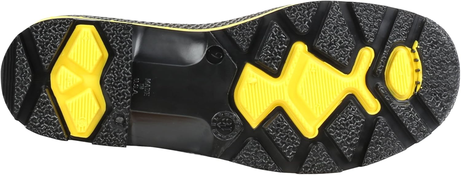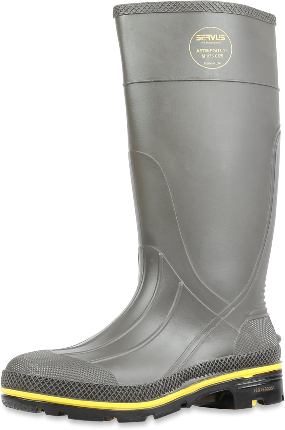 Honeywell Servus PRO Size 9 Men's Knee Boots feature dual compound outsole and "Safe-Toe" steel toe. Grayyellowblack PVC knee boots with 15" height feature extended ribbed steel shank to provide optimum support. Boots featuring TDT (Triple Density Technology) are 3-stage injection-molded for enhanced chemical resistance. The TDT outsole compounds provide longer, comfortable wear while increasing slip resistance and help reduce inventory costs. It also comes with removable and washable ergonomic insoles for improved comfort. 100% Waterproof seamless boots.