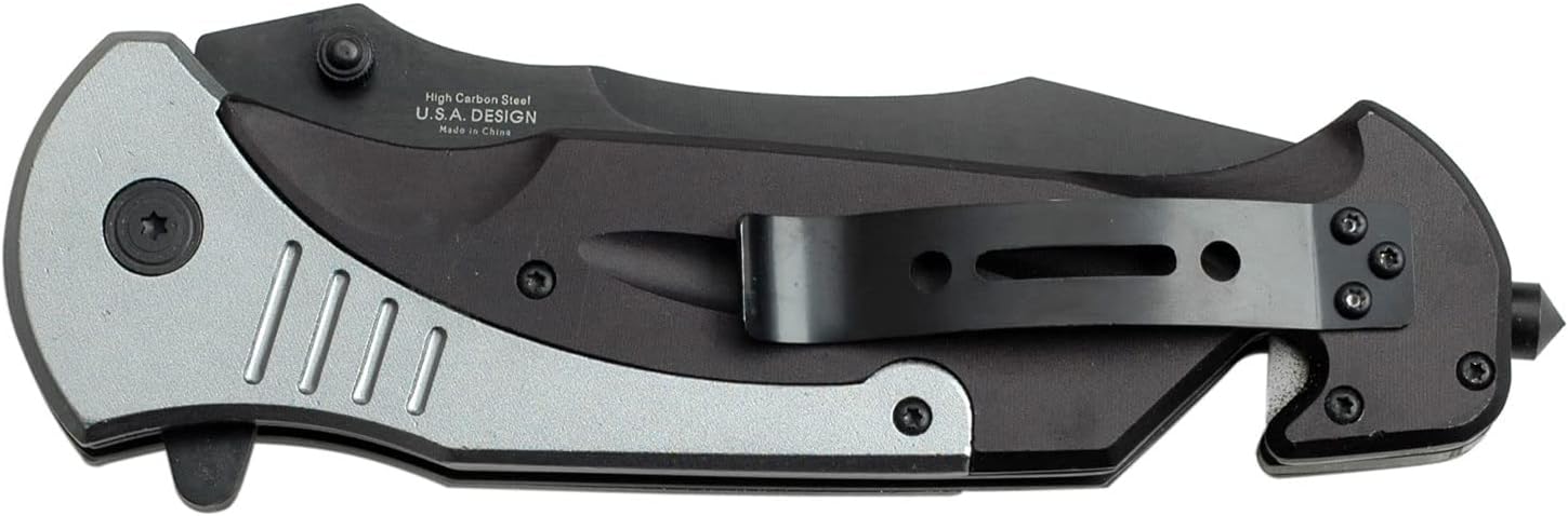 Tac-Force Folding Pocket Knife – Black Partially Serrated Blade, Grey/Black Aluminum Handle w/Sheriff Logo, Rope Cutter, Glass Punch, Pocket Clip, Tactical, EDC, Rescue - TF-727SH