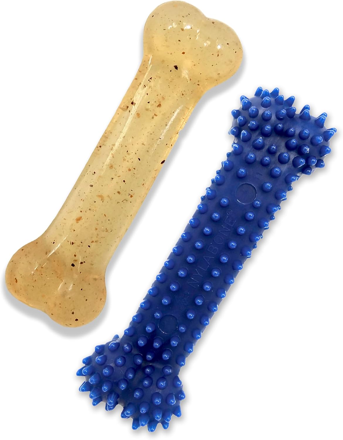 Our Dental Chew and Moderate Chew FlexiChew Twin Pack is designed for moderate chewers who prefer a gentler chewing experience. The Moderate Chew FlexiChew toy keeps dogs entertained with delicious chicken flavor throughout. The Dental Chew has gentle, rounded dental nubs that help clean teeth and massage gums. The bristles raised during chewing both of these bones help clean teeth and control plaque and tartar buildup. (Not recommended for strong chewers.) Go ahead and give your dog a Nylabone! Made in the USA!What your dog chews matters! With destructive behavior among the leading reasons dogs are returned to shelters, we know healthy habits can make a life-changing difference. For 70 years, our family-founded brand continues to safely satisfy dogs’ chewing instincts and help them stay in loving forever homes!