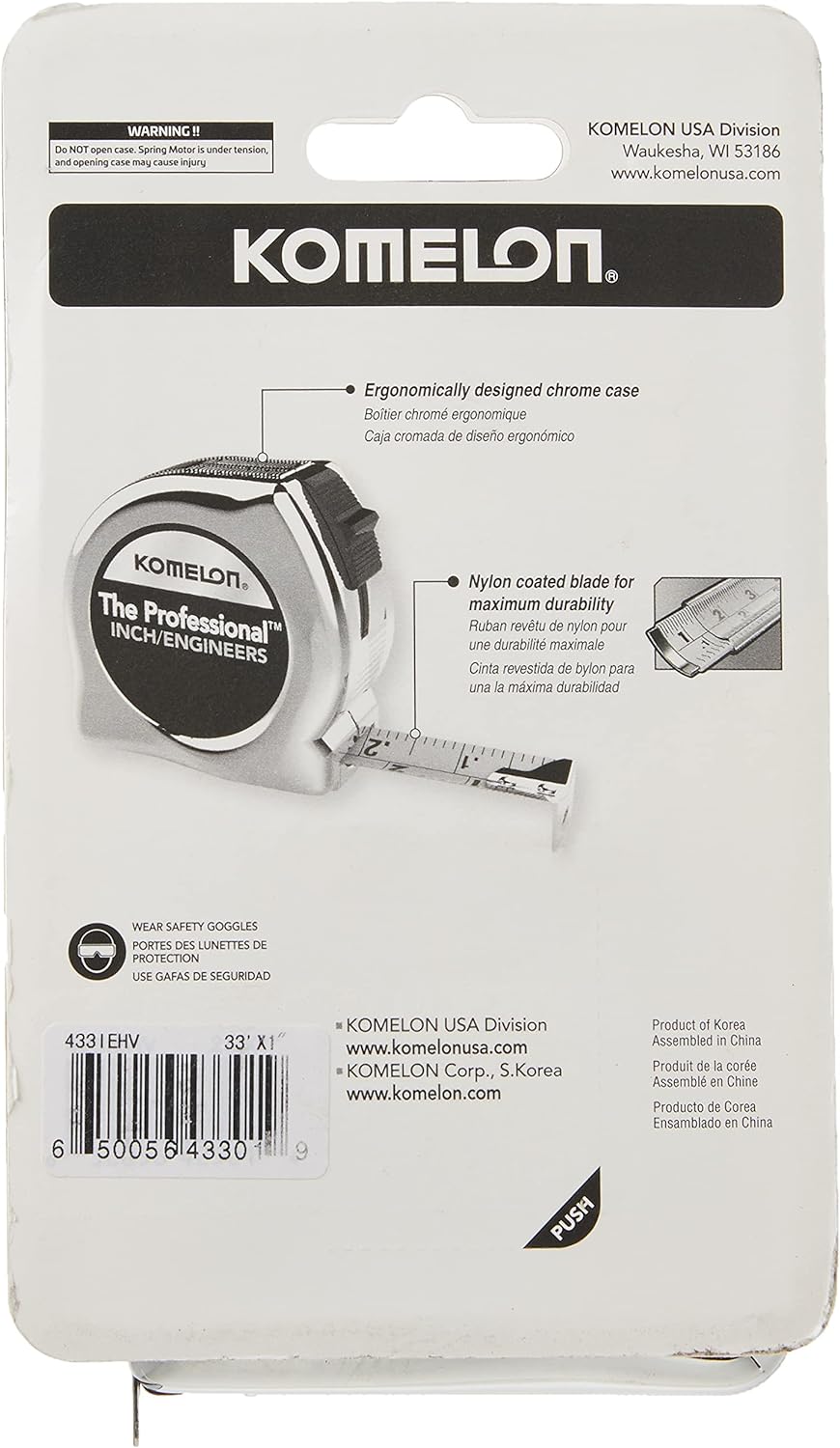 Komelon 433IEHV High-Visibility Professional Tape Measure both Inch and Engineer Scale Printed 33-feet by 1-Inch, Chrome