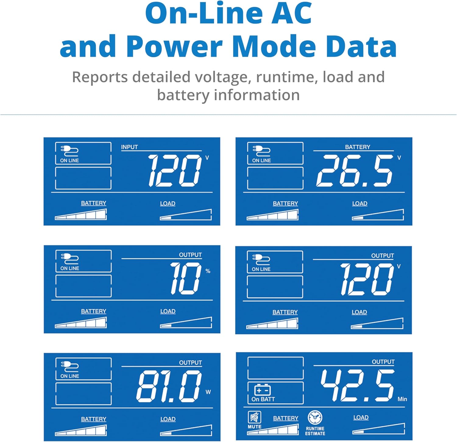ADVANCED POWER FEATURES: Internal batteries are easily user replaceable with Tripp Lite's RBC51 battery cartridge. LCD screen displays power information including battery runtime, wattage load, overload, AVR, input voltage, and battery statuses.