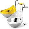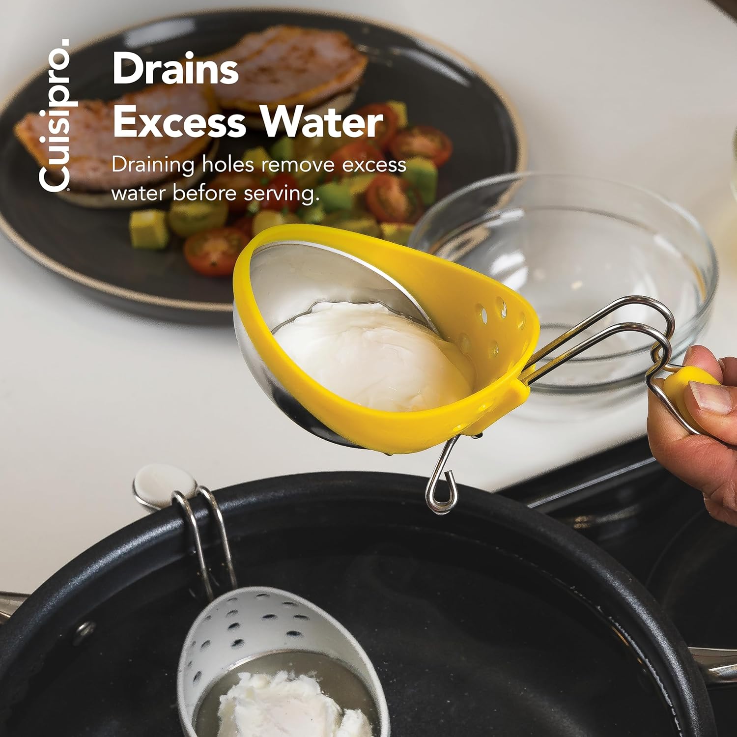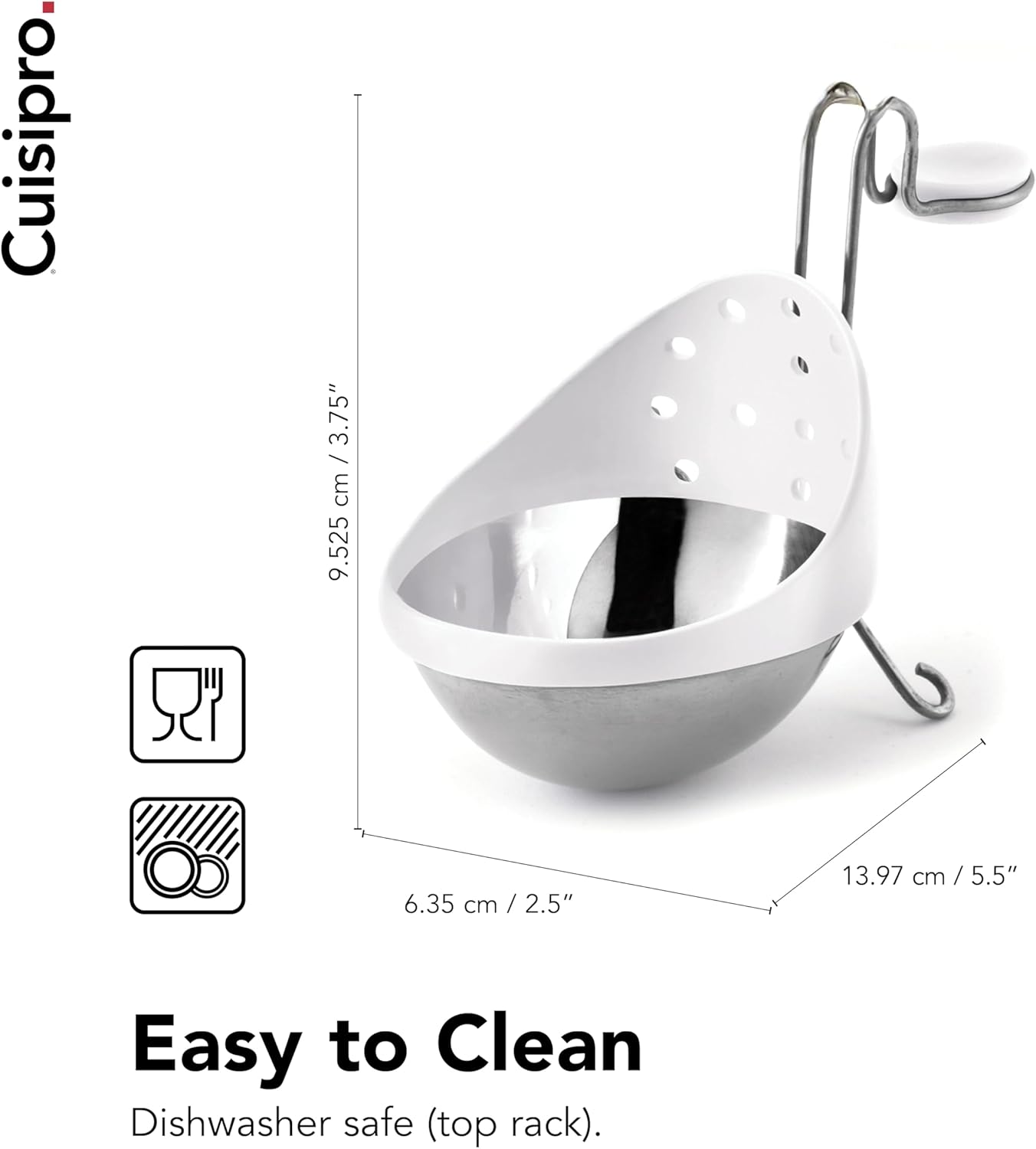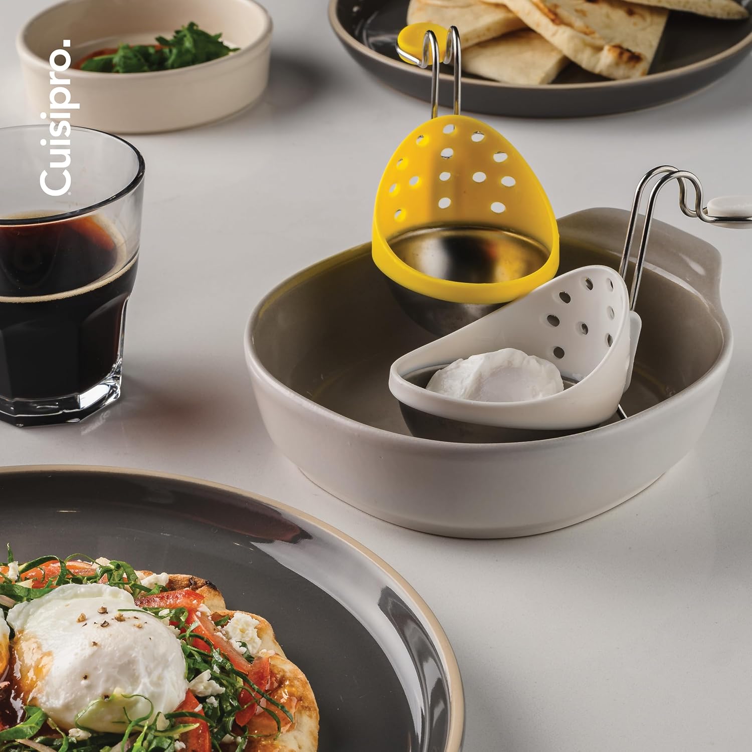 Cuisipro hace que el pochado de huevos sea sencillo. A diferencia de otros "sacudidos" que utilizan una taza sólida que flota sobre el agua y cuece el huevo al vapor, el nuevo sacudidor de huevos de acero inoxidable tiene un diseño de taza que se engancha al lado de la olla y permite que el agua circule alrededor del huevo para un pochado adecuado.