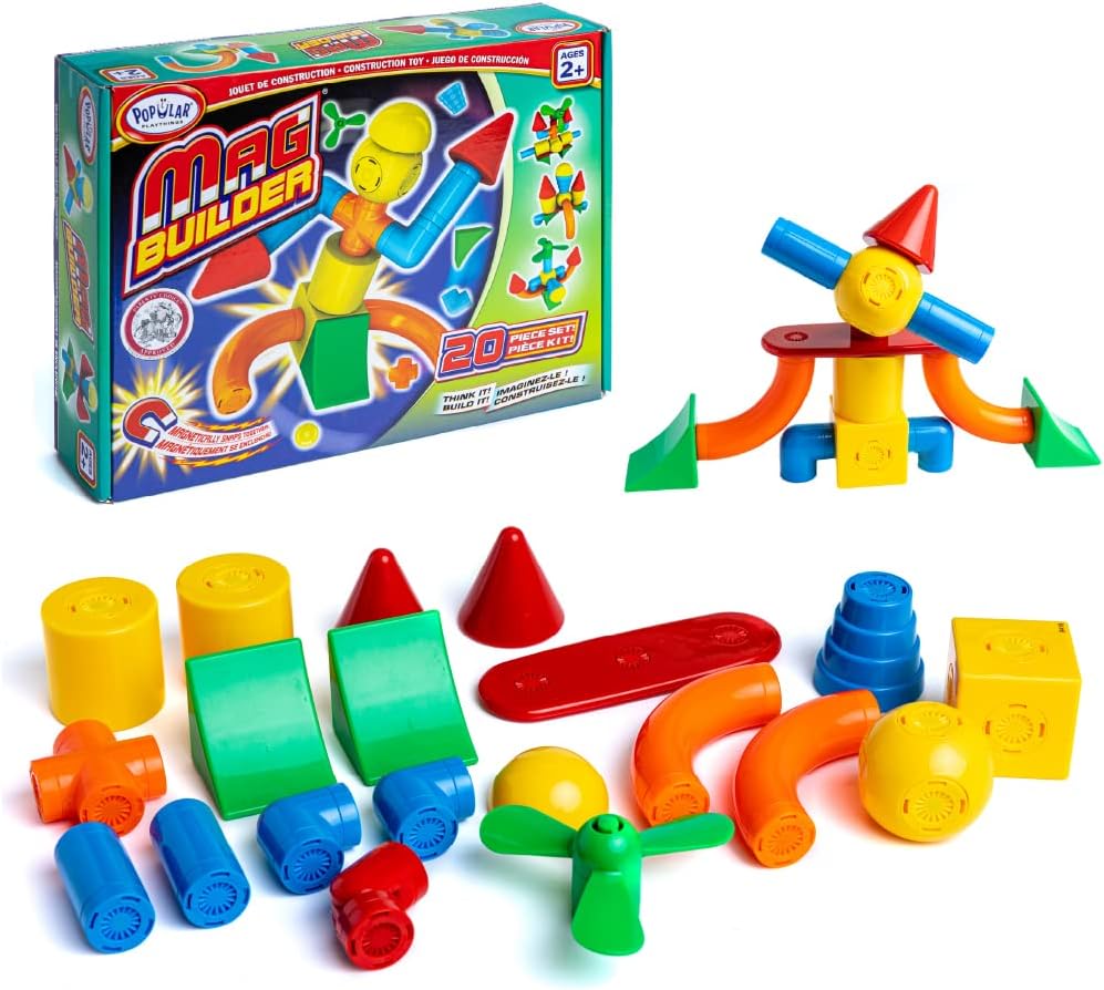 BUILD AND CREATE: Popular Playthings presents the Mag Builder, an exciting way for young builders to create. This cool magnetic toy set includes 20 pieces of the Mag Builder modules and an idea sheet.