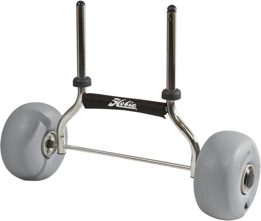 The Hobie Trax 2-30 Kayak Cart has new 30 cm (blow-molded polyurethane) pneumatic tires. These tires have a higher capacity and are very durable! The rim is a smaller diameter which gives a larger sidewall to prevent pinching and valve damage under heavy loads. The pressure range is double that of the original Trax wheels (now 3-4 lbs) which is easier to maintain. The Hobie Trax 2-30 Cart has a 242 lb capacity. This is the best all around cart for soft sand and uneven terrain. The tires are wide and can be deflated for better performance over soft sand and soil. Welded Stainless steel construction, solid stainless axle. Wheels are easily removable for storage. Also includes cart keeper feature and cart clamps. To use the Trax 2-30 cart with a Tandem Island requires the use of the Tandem Island Plug-In Cradle to disperse the load. Capacity: 242 lb / 109.77 kg