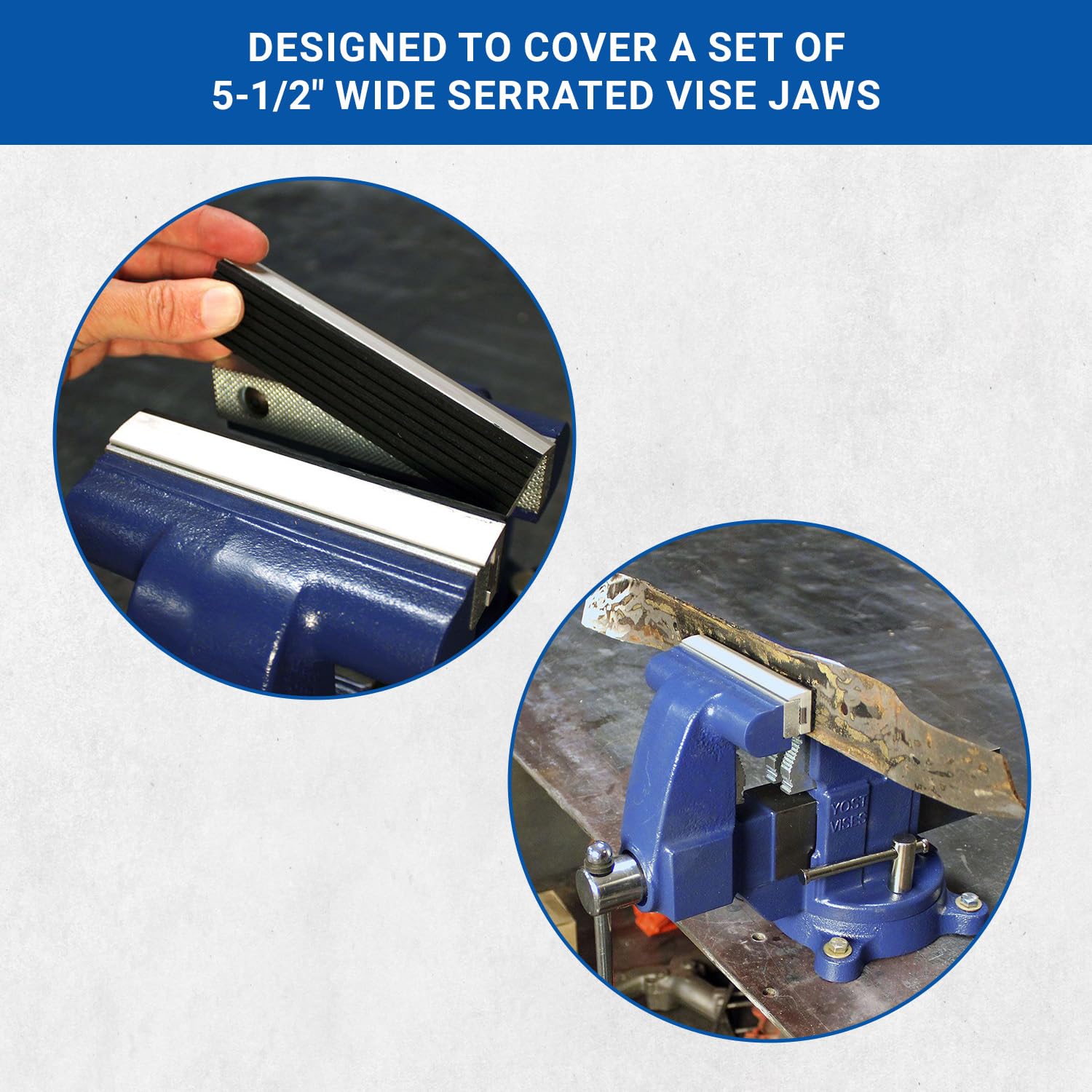Jaw caps attach to and cover a set of 5-1/2"-wide serrated vise jaws to shield delicate work from damage