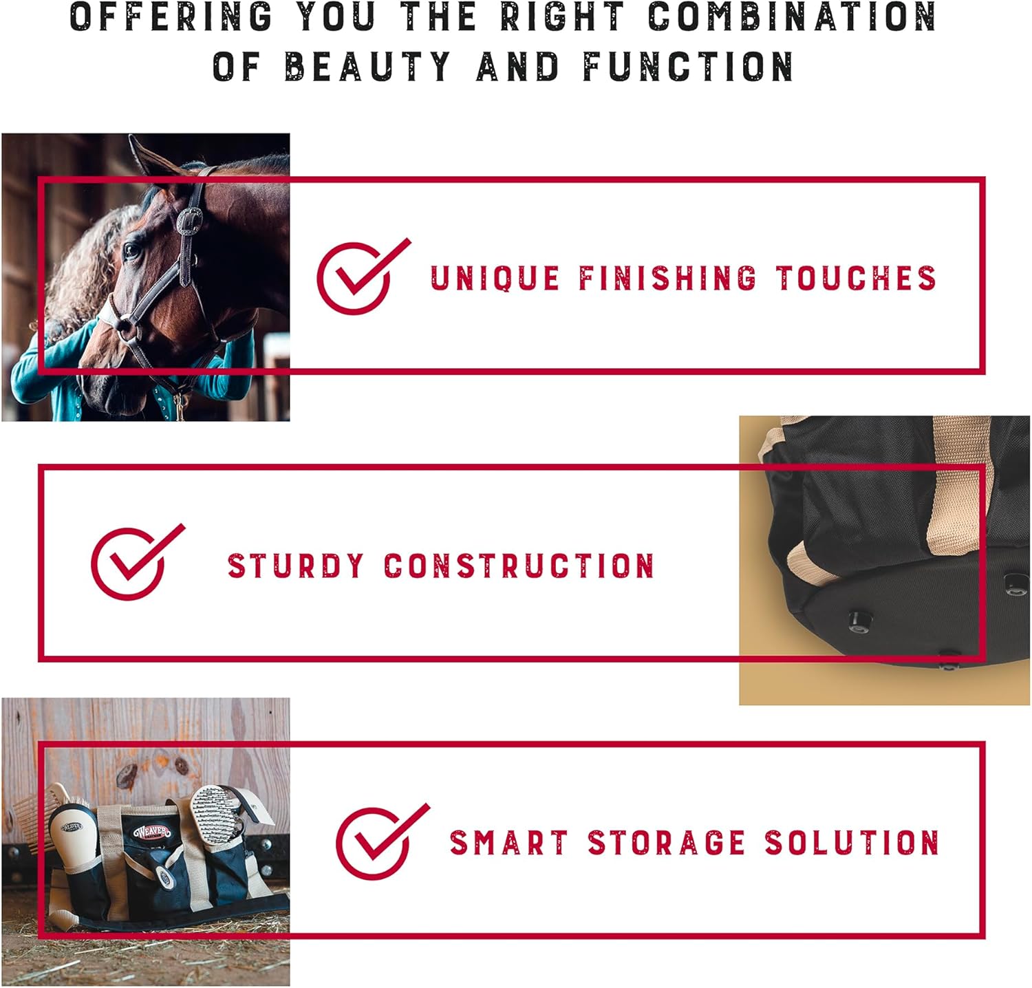 Kit de Cuidado para Caballos Weaver con Bolsa: Kit de suministros de aseo para caballos todo en uno que incluye un surtido cuidadosamente seleccionado de herramientas esenciales de aseo, todas organizadas en una bolsa de nylon duradera. El paquete de herramientas de aseo para caballos de 7 piezas incluye un peine duradero que mantiene las crines y colas en su mejor aspecto, una pinza para pezuñas con cepillo para caballos que cuenta con un cómodo mango de goma para un mejor agarre, un cepillo de curry de mano grueso con mango para menos fatiga, un cepillo de aseo para caballos de mano con cerdas suaves, un cepillo para crines y cola con mango contorneado, y un cepillo dandy para caballos. La combinación de rasqueta para sudor/cepillo de curry grueso cuenta con dos herramientas en una con una hoja de goma curvada en un lado y dientes de curry gruesos en el otro para facilitar la eliminación de suciedad y sudor. Esta bolsa de cepillos para caballos ajustable cuenta con seis bolsillos exteriores, parte superior reforzada con alambre, cierre de cordón superior, fondo de plástico y cuerpo de malla que permite que la suciedad y el pelo escapen. Cuidadosamente diseñada para una experiencia fácil de usar, este equipo para caballos incluye broches para una fácil y rápida extracción. Ya sea en el establo, en una competencia o en viaje, esta bolsa suave para cepillos para caballos asegura que sus herramientas estén siempre organizadas y fácilmente accesibles. Este kit de aseo para caballos es un elemento esencial indispensable y es un gran regalo para dueños y jinetes de caballos por igual.